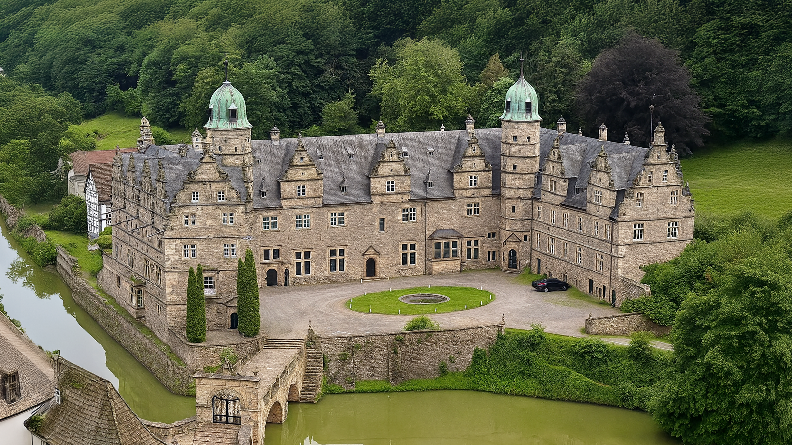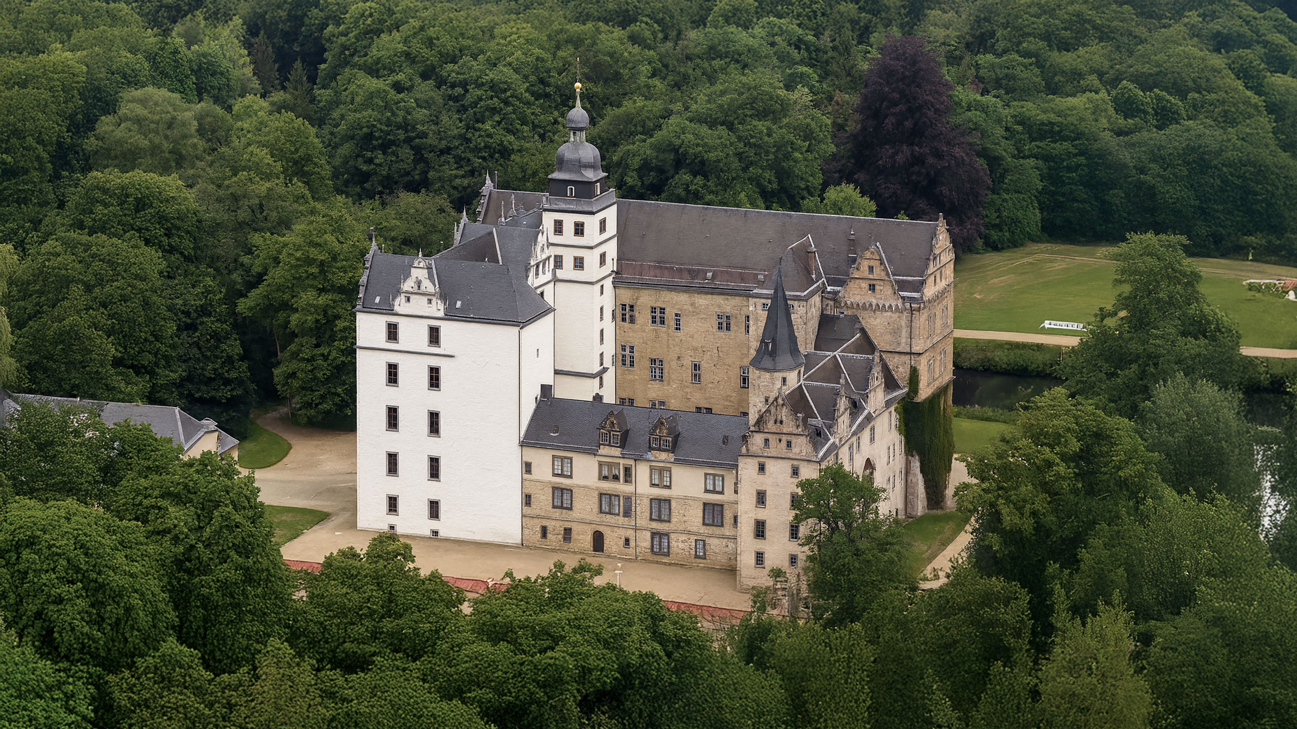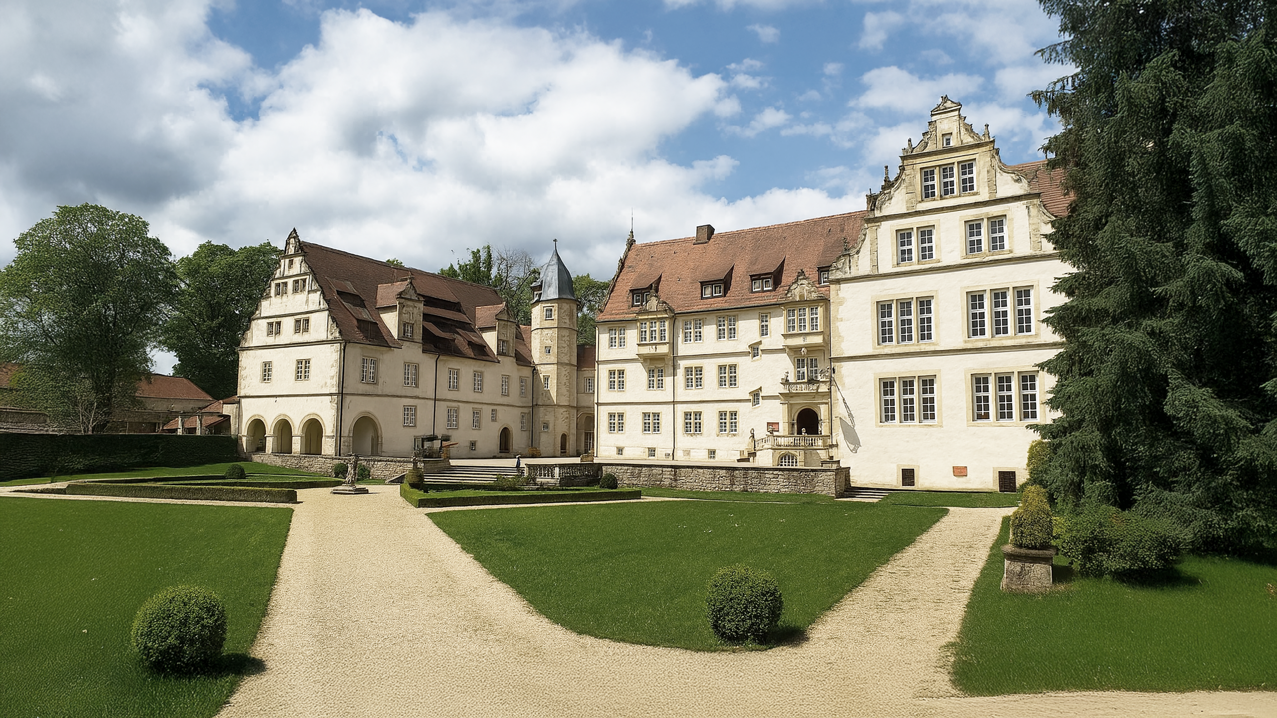Weserrenaissance-Schloss aus dem 17. Jahrhundert, Vierflügelanlage mit Innenhof, Schlosskapelle, Kulturzentrum mit Museumsausstellungen, Schlosspark als traumhafte Fotokulisse